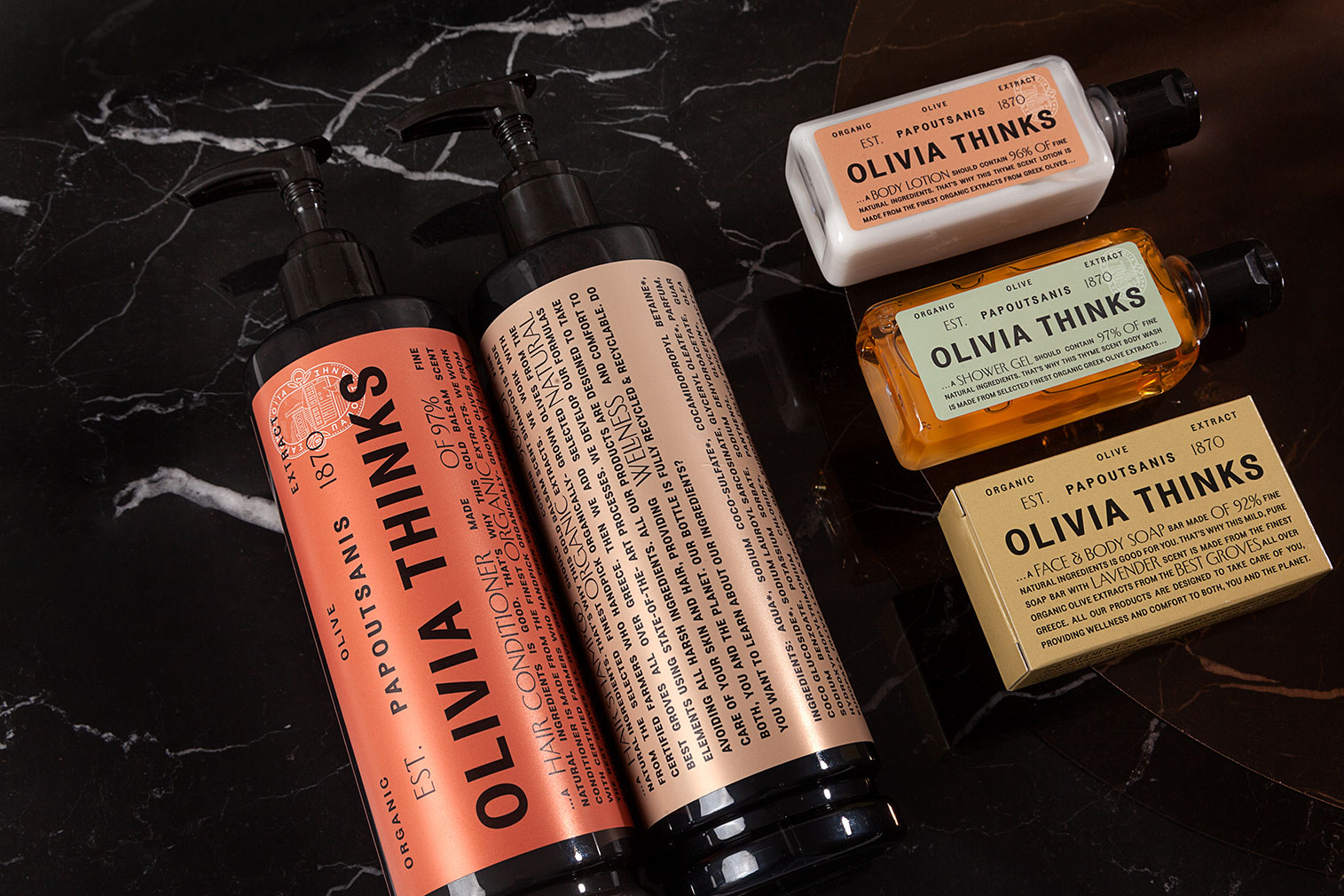 OLIVIA THINKS zeichnet sich durch seine zarte Zusammensetzung aus Bio-Olivenölextrakten, Aloe Vera, äthiopischem Teersamenöl und Vitamin E aus, die die Bedürfnisse der Haut ausgleichen und sie glatt und hydratisiert halten. Ohne chemische Zusätze, mit natürlichen Reinigungsmitteln und revitalisierenden, von der Natur inspirierten Düften: Rose, Zitrone, Orange, Thymian, Lavendel, Amber und Zedernholz bietet Olivia Thinks ein natürliches Gefühl von Wohlbefinden und Verjüngung. Alle Produkte von Olivia Thinks werden ohne Parabene, SLES, Isothiazolinone, BHT, Formaldehyd, EDTA, Silikon und Farbstoffe hergestellt und werden mit einer zu 100 % recycelten und recycelbaren Verpackung geliefert!