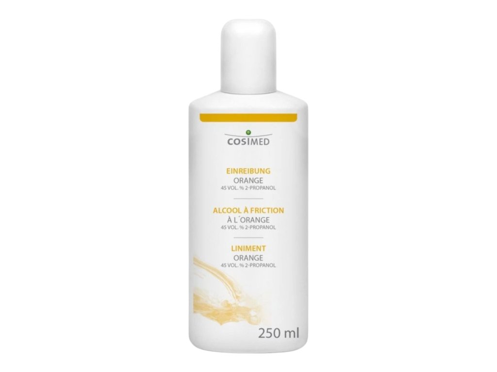 CosiMed Alkoholpräparat mit ätherischem Orangenöl auf Alkoholbasis (45 % Vol. 2-Propanol) ist ein universell einsetzbares Produkt. Der Alkoholgehalt dieser Massageprodukte ist reduziert, so dass sie auch für empfindliche und gereizte Haut geeignet sind.