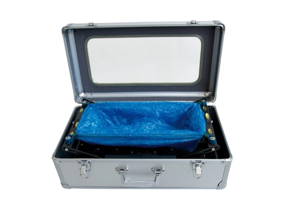 Er ermöglicht das Einlegen von Überschuhen, ohne sich bücken oder das Gerät berühren zu müssen. Das erleichtert den Zugang zu den Räumlichkeiten erheblich und sorgt für Sauberkeit. Stellen Sie einfach Ihren Fuß in den Behälter, und der Überschuh wickelt sich automatisch um Ihren Schuh.