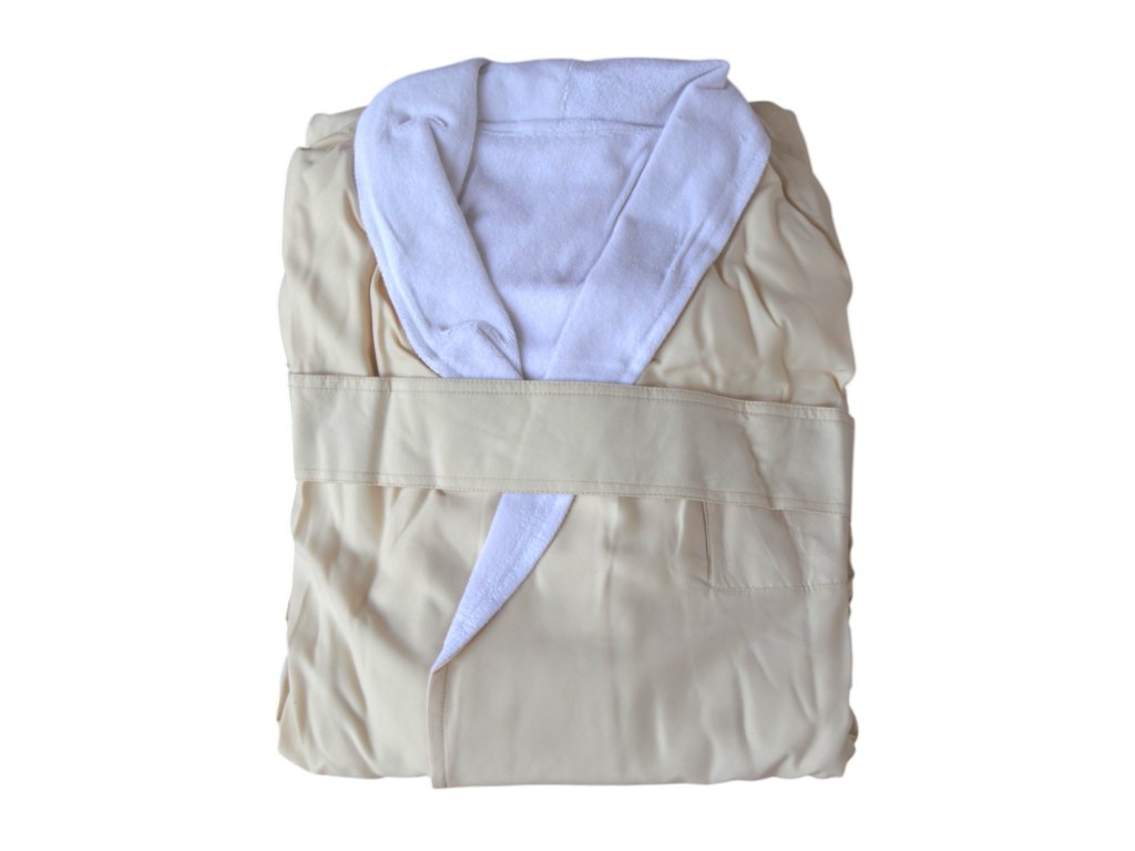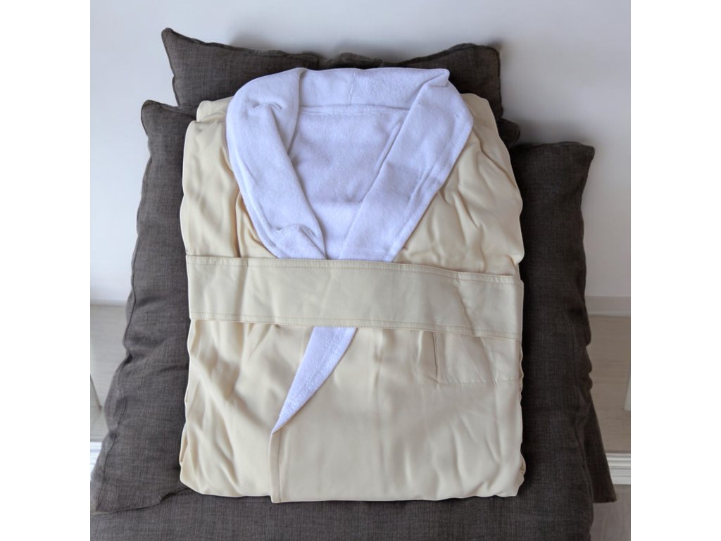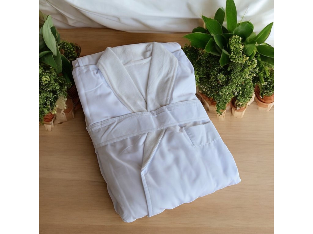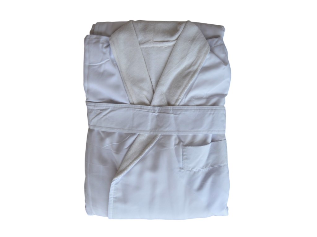 Der Double-Bademantel besteht aus zwei Schichten – die untere Schicht besteht aus Mikrofaser und die obere Schicht aus French Terry. Die Größe ist universell, passend von M bis XXL. Erhältlich in zwei Farben – Weiß und ECRU/Weiß.