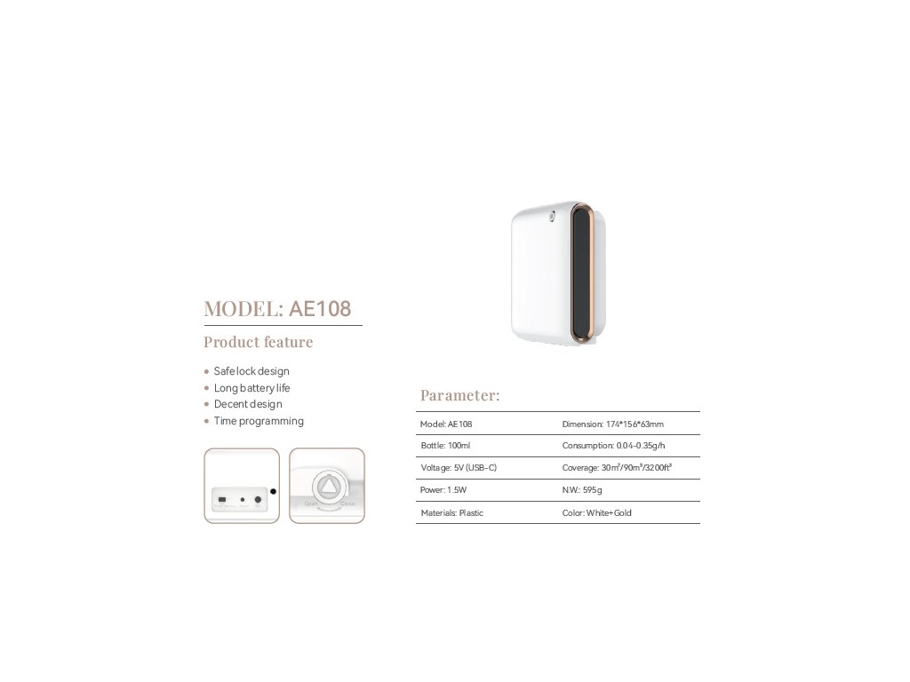 Der AE108 wurde für dynamische kommerzielle Umgebungen entwickelt und unterstützt die intelligente Bluetooth-Steuerung, wodurch eine einfache Anpassung der Duftintensität und der Zeitplanung möglich ist. Dieses personalisierte Dufterlebnis erfüllt die spezifischen Bedürfnisse unterschiedlicher Zeiten und Szenarien. Sichere Verriegelungsmechanismen und einfache Wartung sorgen für Sicherheit und effizienten Betrieb.