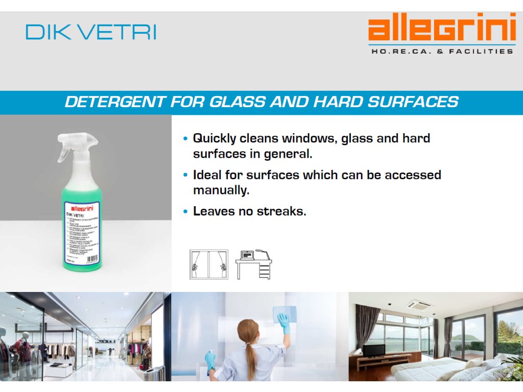 DIK VETRI ist eine nicht nachspülende Flüssigkeit mit Tensiden mit hervorragender Emulgierung von Verunreinigungen. Es garantiert eine effektive Reinigung, Staubentfernung,