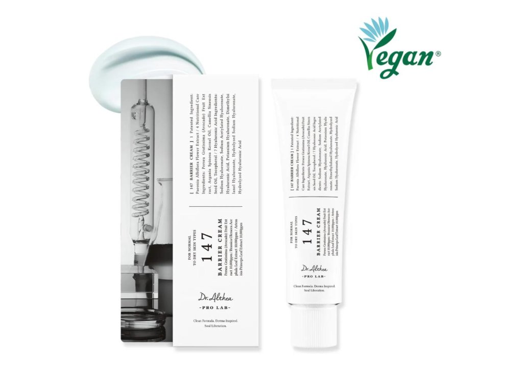 Dr.Althea 147 Barrier cream – beruhigende Gesichtscreme mit Azulen. Enthält Guaiazulen, einen natürlichen Inhaltsstoff, der natürlicherweise in Kamillenöl vorkommt; wirkt intensiv entzündungshemmend und antibakteriell und lindert Reizungen, Aloe Vera-Extrakt, Ceramide und Natriumhyaluronat, die für ausreichend Feuchtigkeit sorgen und die Regeneration beschleunigen, und Kurkuma-Extrakt, der Rötungen und Entzündungssymptome reduziert.