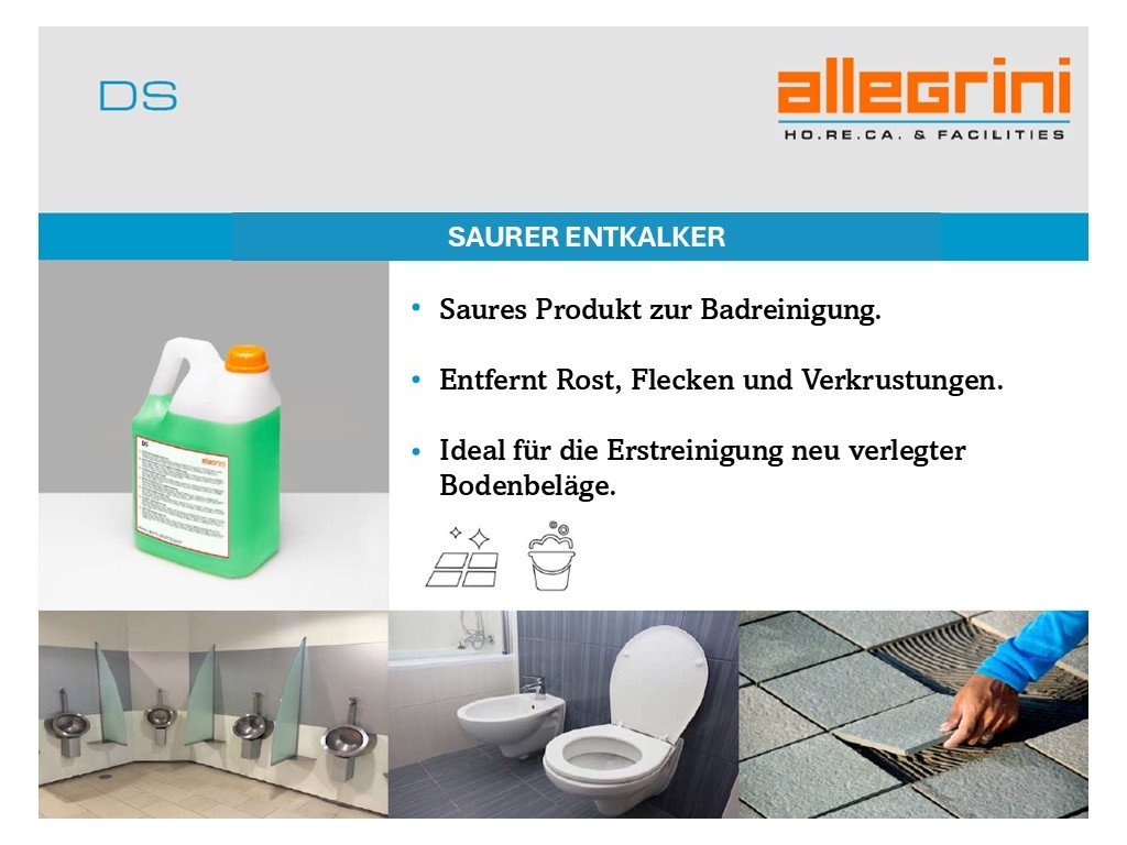 Oberflächen, die ständig mit Wasser in Berührung kommen, wie Toiletten, Badezimmerarmaturen und öffentliche Bereiche, neigen zu Kalkablagerungen. DS ist ein saurer Entkalker für Sanitärbereiche und ideal für die allgemeine Reinigung von Toiletten, Badezimmern, Poolbereichen und allen Arten von Fliesenoberflächen wie Feinsteinzeug, Keramik und Terrakotta. Er entfernt Rost, Flecken und Ablagerungen aus Toilettenbecken und hinterlässt keine Rückstände. Mörtel- und Betonreste werden mühelos entfernt. Bei kurzem Kontakt kann DS auch auf lackierten und gestrichenen Oberflächen verwendet werden.