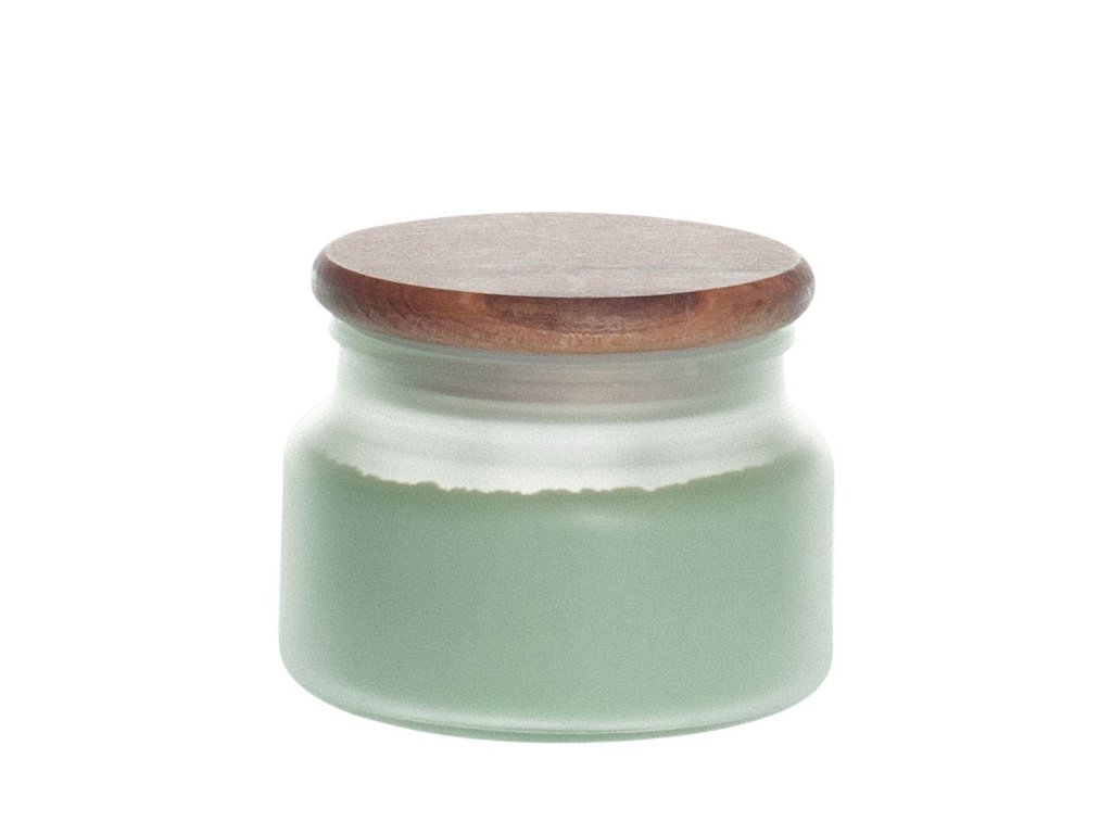 Glasgefäß mit „gefrorenem“ Glas und Holzdeckel.