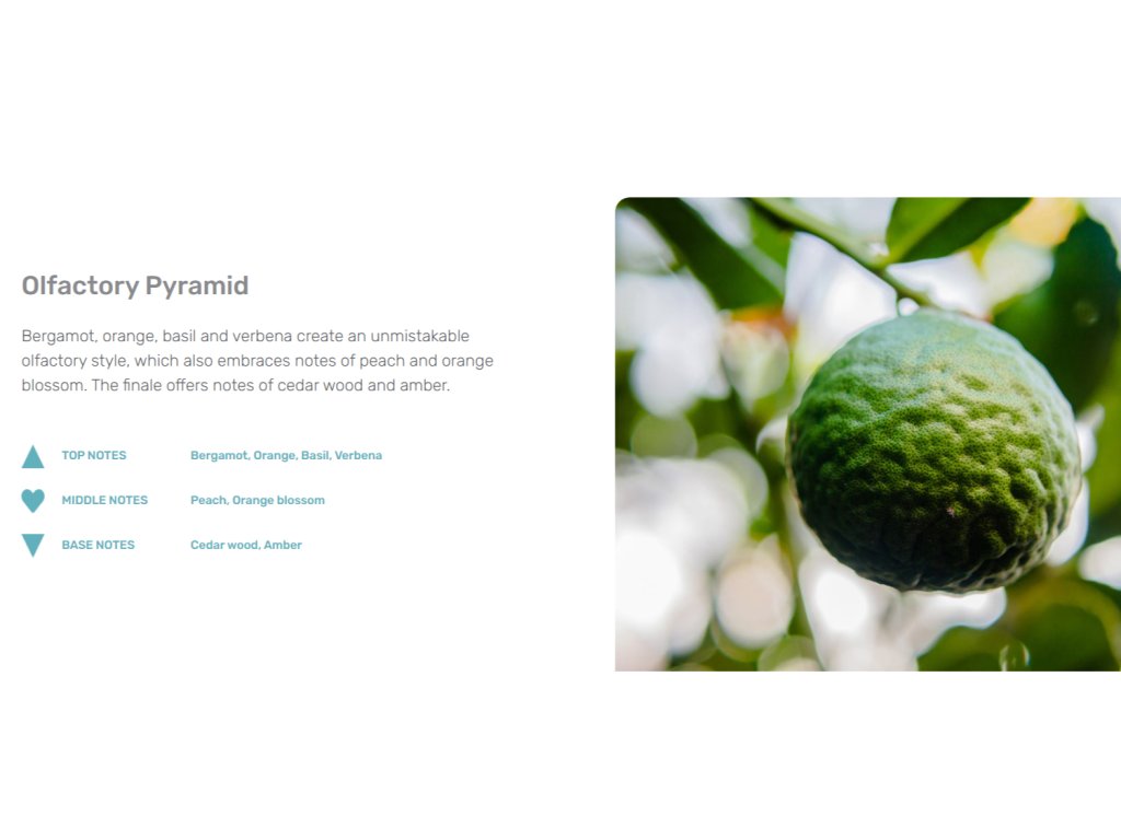 Duftpyramide: Bergamotte, Orange, Basilikum und Eisenkraut kreieren einen unverwechselbaren Duftstil, der auch Noten von Pfirsich und Orangenblüte beinhaltet. Der Abgang bietet Noten von Zedernholz und Amber.