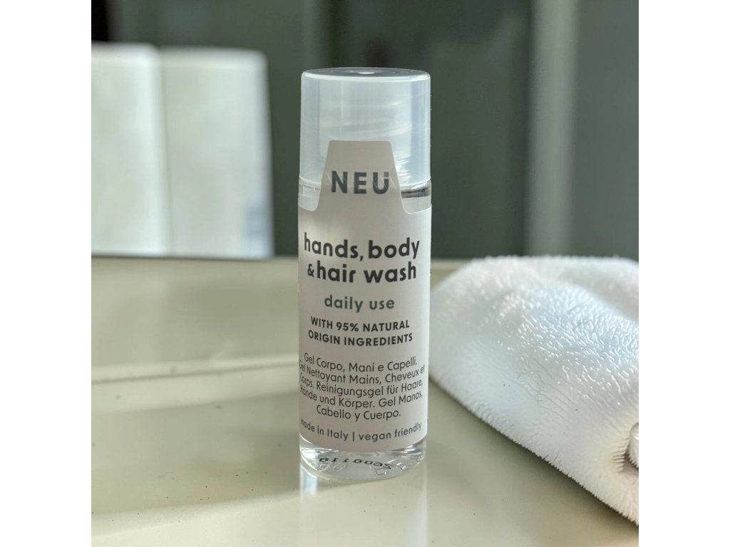 Das Duschgel für Haare, Körper und Hände NEU mit frischem Blumenduft sorgt den ganzen Tag für ein Gefühl von Sauberkeit und angenehmer Frische. Seine vegane Formel mit 95 % Inhaltsstoffen natürlichen Ursprungs ist sanft zu Haut und Umwelt. Es ist ein praktisches Multifunktionsprodukt für die Hotelkosmetik und wurde für maximalen Komfort der Gäste während ihres Aufenthalts entwickelt. Es vereint sanfte Pflege für Körper, Hände und Haare in einem Produkt und bietet somit eine einfache und effektive Lösung für die tägliche Hygiene.