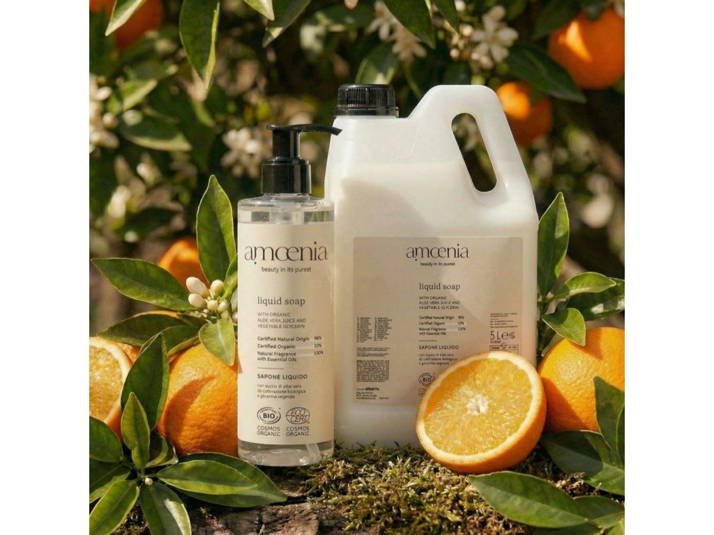 Flüssigseife 5L AMOENIA (Kanister) ist ein ideales Produkt zur Pflege der Haut der Hände. Dank der Anwesenheit von Bio-Aloe Vera und pflanzlichem Glycerin ist sie weich und duftend.