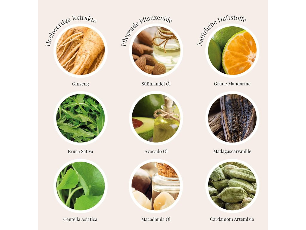Angereichert mit Ginseng-Extrakt. Die erfrischenden Eigenschaften der Ginsengpflanze sind im Orient seit Jahrhunderten bekannt. Extrakte aus ihren Wurzeln wirken erfrischend und revitalisierend auf die Haut. Ein berauschender Duft, der Kraft und Charakter mit einer warmen und entspannenden Atmosphäre verbindet.