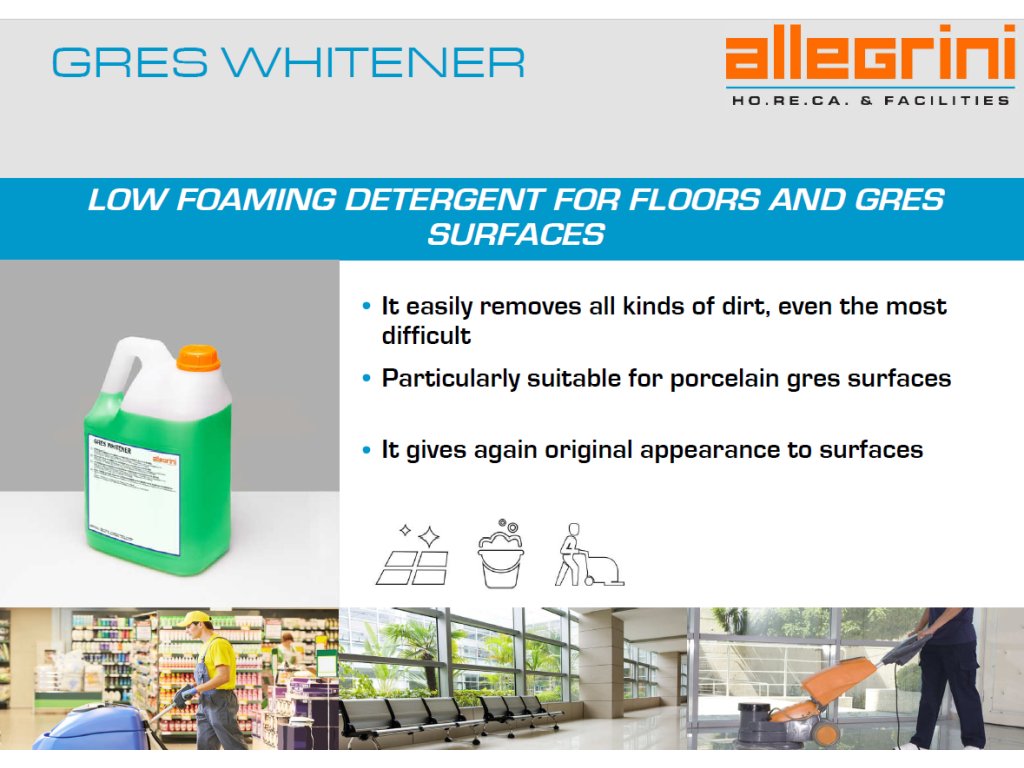 VERWENDUNG: GRES WHITENER ist ein schwach schäumendes konzentriertes Produkt mit hoher Entfettungskraft, besonders geeignet für Feinsteinzeugböden mit Bodenreinigungsmaschinen. Die spezielle Formulierung mit außergewöhnlicher Entfettungsfähigkeit sorgt für die Entfernung aller Verunreinigungen von allen Böden, insbesondere von rutschfesten Steinoberflächen, und gibt den grauen Fliesen dank der außergewöhnlichen Weißkraft ihr ursprüngliches Aussehen zurück.