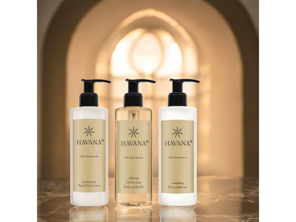 HAVANA: Von der Thalassotherapie inspirierte Hotelkosmetik mit ihrem erfrischenden und gesunden Duft, der von der Thalassotherapie inspiriert ist, besteht aus Produkten zur Bekämpfung von Stress und Müdigkeit. Alle Vorteile der Therapie, die bis in die Antike zurückreicht, sind in dem stark feuchtigkeitsspendenden und remineralisierenden Oligoelement-Konzentrat enthalten. Sein besonderer Duft erinnert an Düfte aus der Kolonialzeit, was Havana zu einer wunderbaren Linie mit exotischen Anspielungen macht.