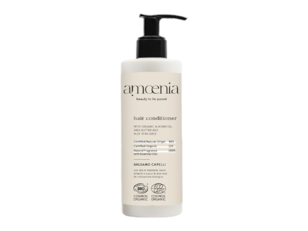 Haarspülung 300 ml AMOENIA mit Pumpspender ist mit biologisch angebauten Inhaltsstoffen wie Mandelöl, Sheabutter und Aloe-Vera-Saft angereichert, spendet Feuchtigkeit, regeneriert das Haar und macht es weich und entwirrt. Ideal für häufiges Waschen.