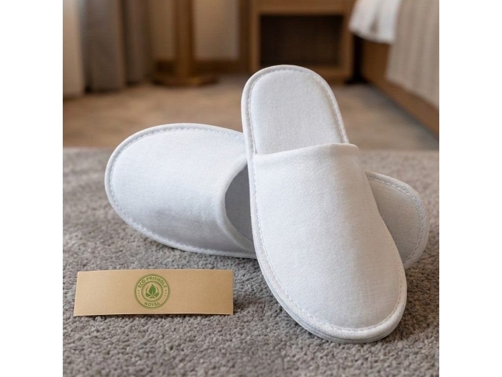 Die Sohle besteht aus 5 mm dickem EVA-Material, das für alle Arten von Bodenbelägen geeignet ist. Sie haben eine Standardgröße von 29 cm, können aber vollständig personalisiert werden, einschließlich eines gestickten oder gedruckten Logos. Sie werden in einem Karton mit 200 Stück geliefert, jedes Paar ist entweder in einem separaten Hygienebeutel oder in einem ökologischen Papierring mit dem ECO FRIENDLY HOTEL-Logo getrennt.
