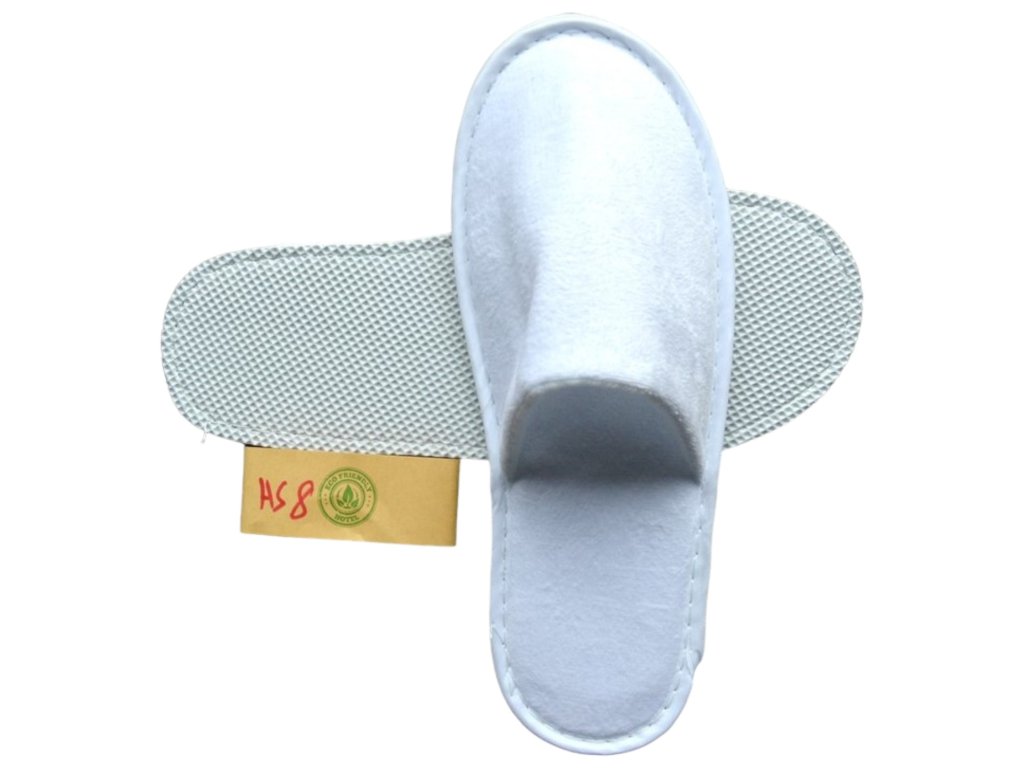 Die Sohle besteht aus 6 mm dickem EVA-Material und ist für alle Arten von Bodenoberflächen geeignet. Sie werden in einer Standardgröße von 28,50 cm geliefert, können aber vollständig personalisiert werden, einschließlich eines gestickten oder gedruckten Logos. Sie werden in einem Karton mit 100 Stück geliefert, wobei jedes Paar einzeln entweder in einem separaten Hygienebeutel oder in einem ökologischen Papierkorb mit dem ECO FRIENDLY HOTEL-Logo verpackt ist.