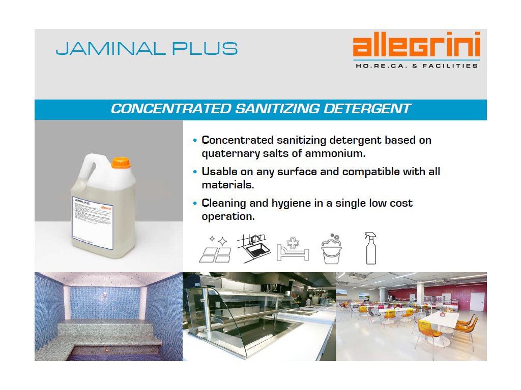 JAMINAL PLUS ist ein konzentriertes, geruchloses Desinfektionsmittel. Die Zusammensetzung enthält Tenside, alkalisierende, quartäre Ammoniumsalze, die speziell zum Reinigen und Desinfizieren auf harten Oberflächen, wie z. Fliesen, Stahl, Glas, Aluminium, Kunststoff ... Geeignet für Küchen, Schwimmbäder, Fitnessstudios, Toiletten, Restaurants, Bars, Supermärkte, Schönheitssalons usw., wenn der Einsatz einer Vielzahl von Desinfektionsmitteln erforderlich ist.