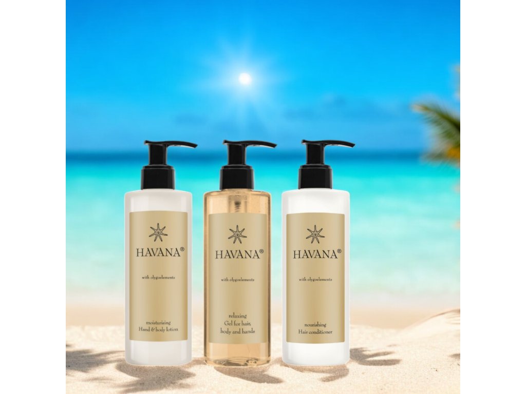 HAVANA: Von der Thalassotherapie inspirierte Hotelkosmetik mit ihrem erfrischenden und gesunden Duft, der von der Thalassotherapie inspiriert ist, besteht aus Produkten zur Bekämpfung von Stress und Müdigkeit. Alle Vorteile der Therapie, die bis in die Antike zurückreicht, sind in dem stark feuchtigkeitsspendenden und remineralisierenden Oligoelement-Konzentrat enthalten. Sein besonderer Duft erinnert an Düfte aus der Kolonialzeit, was Havana zu einer wunderbaren Linie mit exotischen Anspielungen macht.