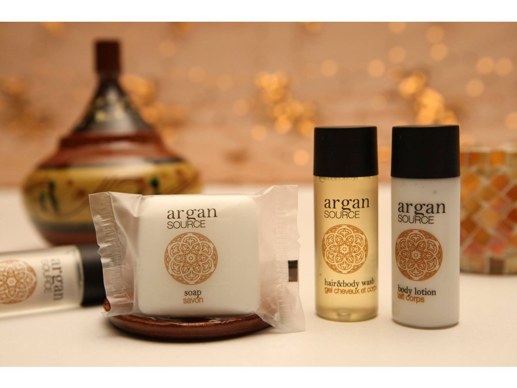 Hotelkosmetik ARGAN SOURCE, die Bio-Arganöl enthält. Ein Schönheitselixier, das dank seiner Antioxidantien zu einer Notwendigkeit in der Kosmetik geworden ist. Es hat auch eine weichmachende und feuchtigkeitsspendende Wirkung. Der bezaubernde Duft und das elegante Satindesign bringen Ihre Gäste in die Atmosphäre Marokkos. Anspruchsvolle Qualität, inspiriert vom Gold der Wüste.
