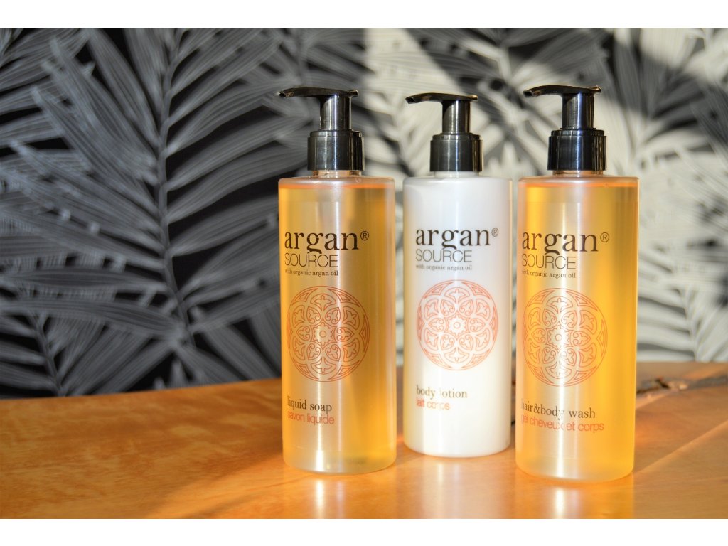 Hotelkosmetik ARGAN SOURCE, die Bio-Arganöl enthält. Ein Schönheitselixier, das dank seiner Antioxidantien zu einer Notwendigkeit in der Kosmetik geworden ist. Es hat auch eine weichmachende und feuchtigkeitsspendende Wirkung. Der bezaubernde Duft und das elegante Satindesign bringen Ihre Gäste in die Atmosphäre Marokkos. Anspruchsvolle Qualität, inspiriert vom Gold der Wüste.