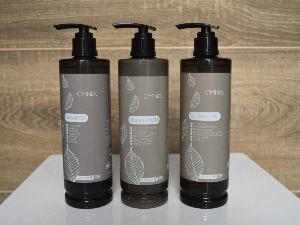 Körperlotion Omnia 400 ml mit Vitamin A und Gurkenextrakt. Hotelkosmetik für die tägliche Hautpflege. Die leichte Formel zieht schnell ein, spendet Feuchtigkeit und beruhigt die Haut. Sie macht sie geschmeidig und geschmeidig. Gurkenextrakt erfrischt und Vitamin A unterstützt die Hautregeneration und -hydratation.