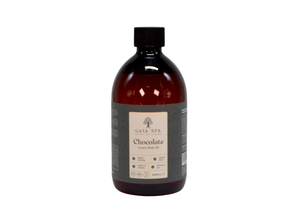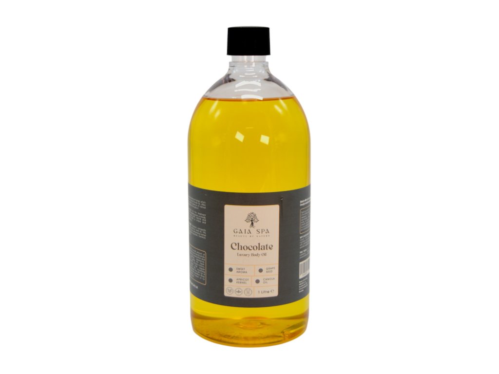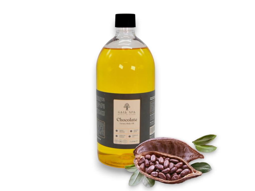 Luxus-Massageöl Chocolate (Schokolade) - GAIA SPA mit einem reichen und erkennbaren Aroma. Gönnen Sie sich den Luxus von nährendem Schokoladenöl, das die Haut intensiv mit Feuchtigkeit versorgt und verjüngt. Dieses Öl hinterlässt ein weiches, glattes und genährtes Hautgefühl, während der beruhigende, süße Duft Ihre Sinne verwöhnt. Es wird Ihnen ein perfektes Wellness-Erlebnis bieten.