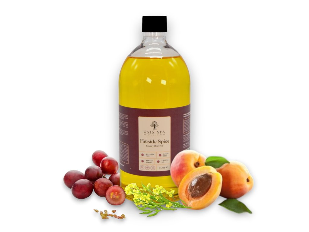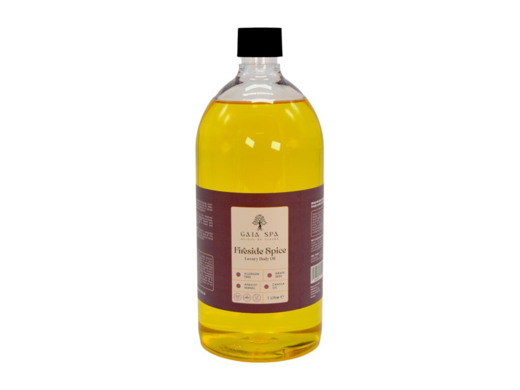Massageöl Fireside Spice - GAIA SPA.Diese allergenfreie Formel bietet ein reichhaltiges, wohltuendes Erlebnis und kombiniert tiefe Feuchtigkeit mit einem köstlichen, dezent würzigen Aroma, das gemütliche Momente am Kamin hervorruft.Dieses Öl eignet sich perfekt für eine saisonale Behandlung, da es die Haut weich, genährt und wunderbar mit Feuchtigkeit versorgt und somit perfekt für die kälteren Monate geeignet ist. Es bietet eine außergewöhnliche Gleitfähigkeit bei Massagen, die hypoallergene Zusammensetzung ist für alle Hauttypen geeignet und macht es zu einer vielseitigen Wahl für eine breite Kundschaft.