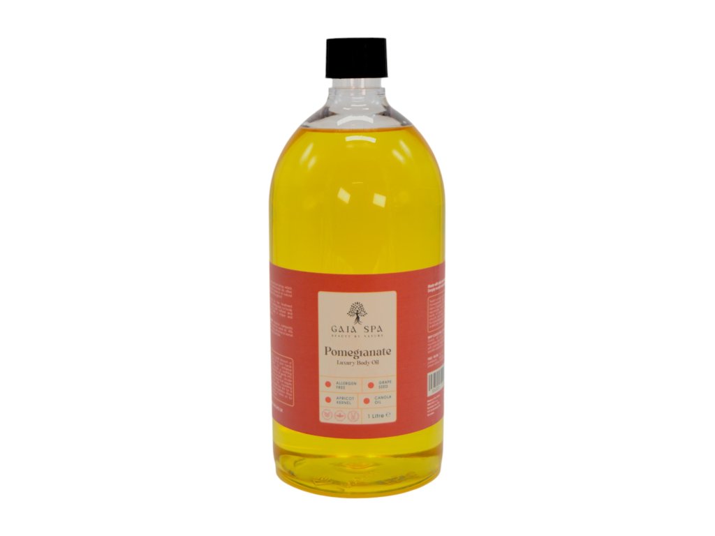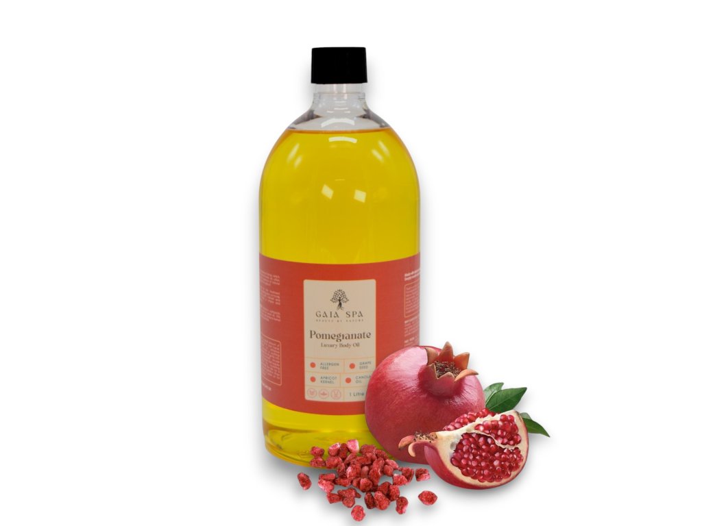 Massageöl Granatapfel - GAIA SPA.Füllen Sie Ihr Wellness-Erlebnis mit Granatapfel-Körperöl. Eine luxuriöse Mischung, die die Haut nährt und die Entspannung steigert. Dank seiner allergenfreien Zusammensetzung pflegt dieses Öl selbst die empfindlichste Haut und verleiht ihr Feuchtigkeit und ein samtig weiches Gefühl.Der verführerische Duft des Granatapfels verbindet sich mit dem Reichtum natürlicher Öle und hinterlässt eine strahlende und zart duftende Haut.Seine leichte Textur zieht wunderbar ein und eignet sich daher ideal für Behandlungen, die nur minimale Rückstände erfordern und gleichzeitig maximale Feuchtigkeit spenden.