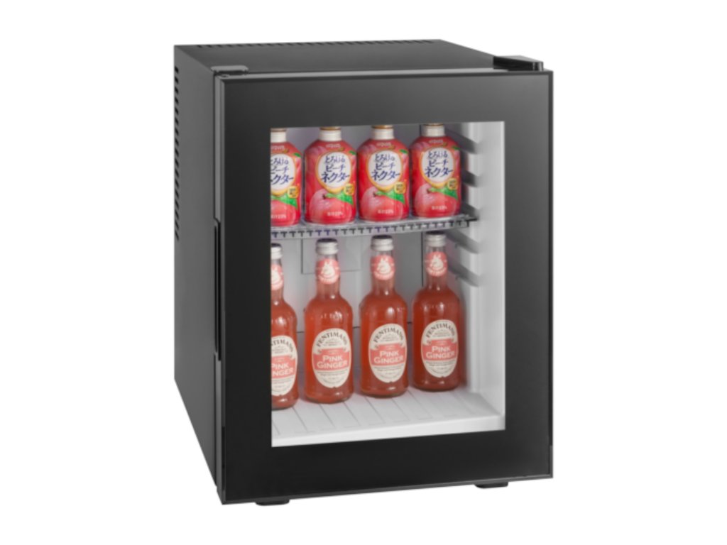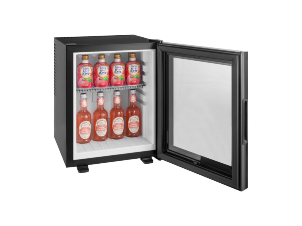 Diese Minibar mit doppelseitigen Glastüren und schwarzem Finish ist die perfekte Aufwertung jedes Hotelzimmers.