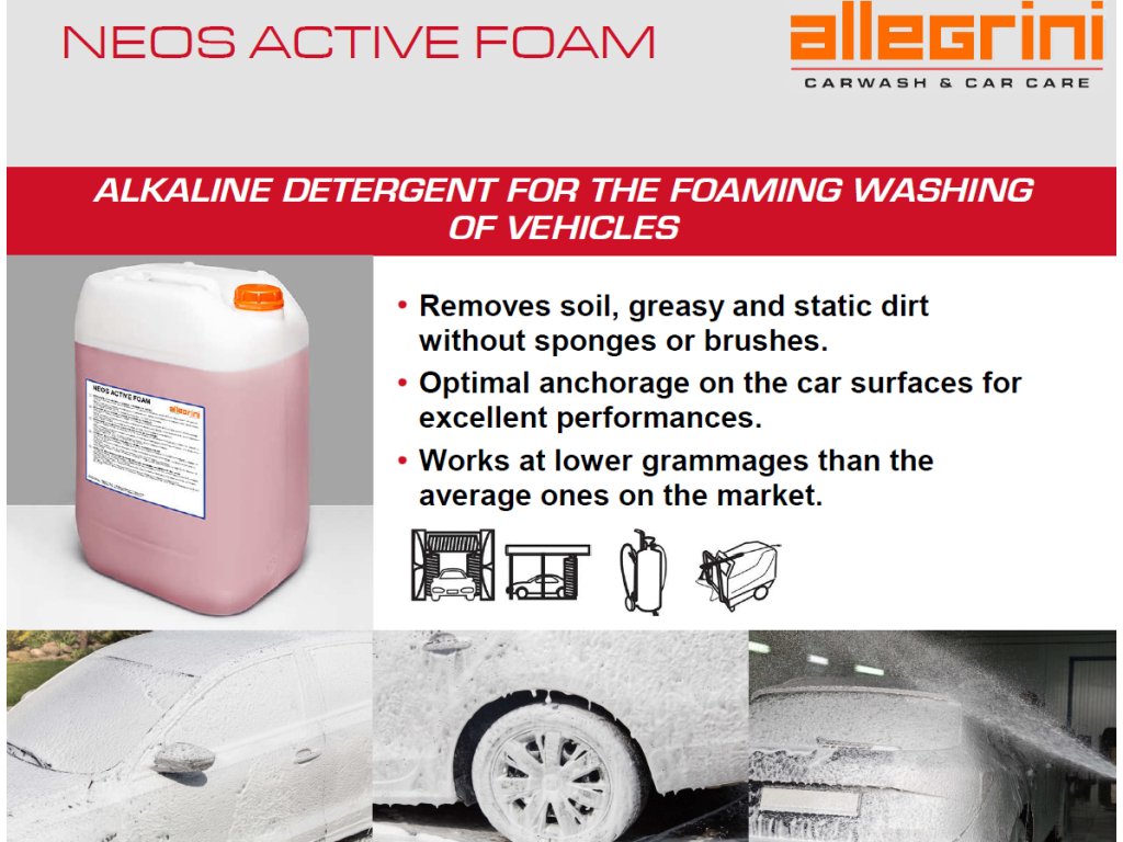 VERWENDUNG: NEOS ACTIVE FOAM ist ein stark schäumendes alkalisches Reinigungsmittel für die Autowäsche. Dank seiner speziellen Aktivschaumformulierung kann er Schmutz, Fett und statische Verschmutzungen (z. B. Transportfolie) ohne Schwämme oder Bürsten entfernen. Der Aktivschaum bleibt lange auf den Fahrzeugoberflächen verankert und sorgt so für eine höhere Reinigungswirkung und hervorragende Ergebnisse. Außerdem entsteht ein antistatischer und superglänzender Film, der dem Auto Glanz verleiht. Während der Spülphase entwickelt das Produkt keinen zusätzlichen Schaum. NEOS ACTIVE FOAM arbeitet mit geringeren Gewichten als Produkte anderer Marken und ist daher eines der kostengünstigsten Reinigungsmittel.