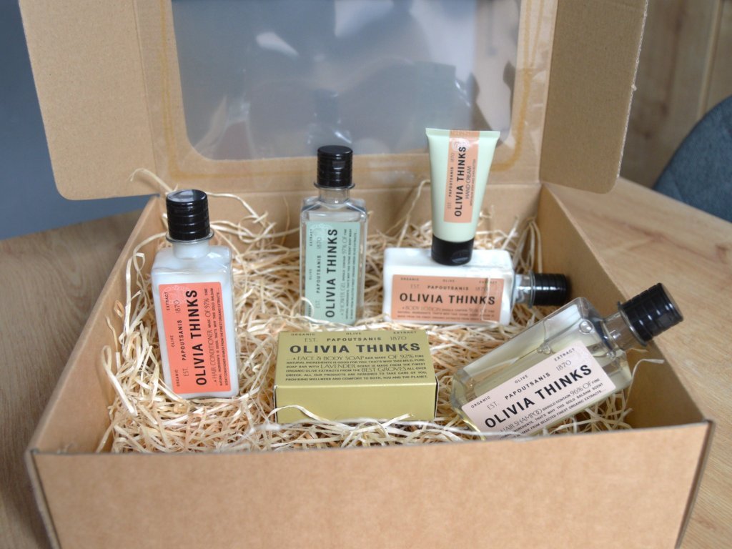 OLIVIA THINKS – Eine sanfte Formel mit Extrakten aus Bio-Olivenöl, Aloe Vera, äthiopischem Weinsteinöl und Vitamin E. Frei von chemischen Zusätzen, mit natürlichen Reinigungsstoffen und revitalisierenden Düften, inspiriert von Thymian, Lavendel, Ambra und Zedernholz. Alle Olivia-Produkte sind frei von Parabenen, SLES, Isothiazolinonen, BHT, Formaldehyd, EDTA, Silikon und Farbstoffen und werden in 100 % recycelten und recycelbaren Verpackungen geliefert! UNSERE AUSWAHL FÜR SIE: Gesichts- und Körperseife 40g, Shampoo 7 ml, Körpercreme 70ml, Spülung 70ml, Duschgel 70ml, Handcreme 15ml.