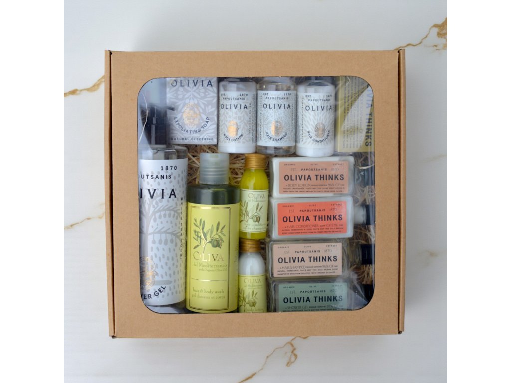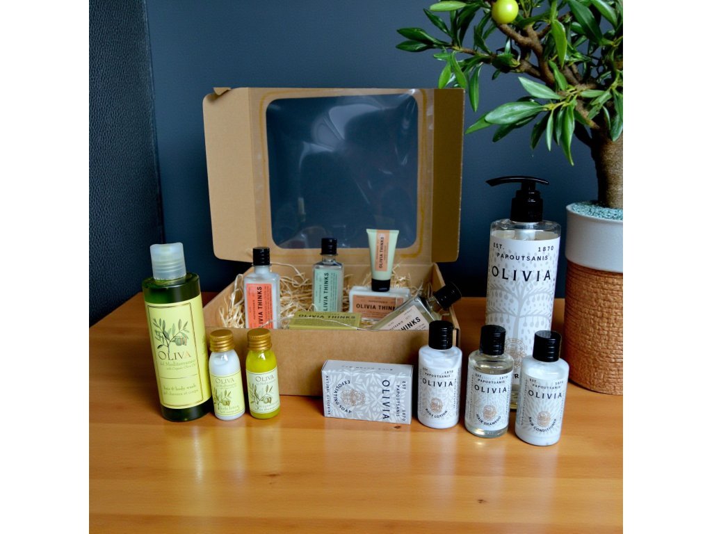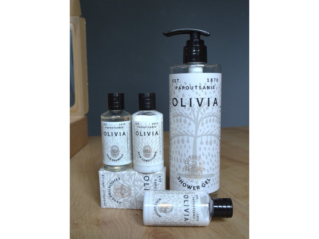 OLIVIA – Verleiht Ihnen das natürliche Gefühl mediterraner Olivenhaine und verwöhnt Sie mit den zarten Eigenschaften der Olive. Ein reines und authentisches Erlebnis, das Körper, Geist und Sinne mit belebenden Düften von Bergamotte, Pfirsich, weißem Moschus und Lavendel stimuliert und verwöhnt! UNSERE AUSWAHL FÜR SIE: Duschgel 380ml, Peeling-Seife 40g, Shampoo 60ml, Spülung 60ml, Körpercreme 60ml.