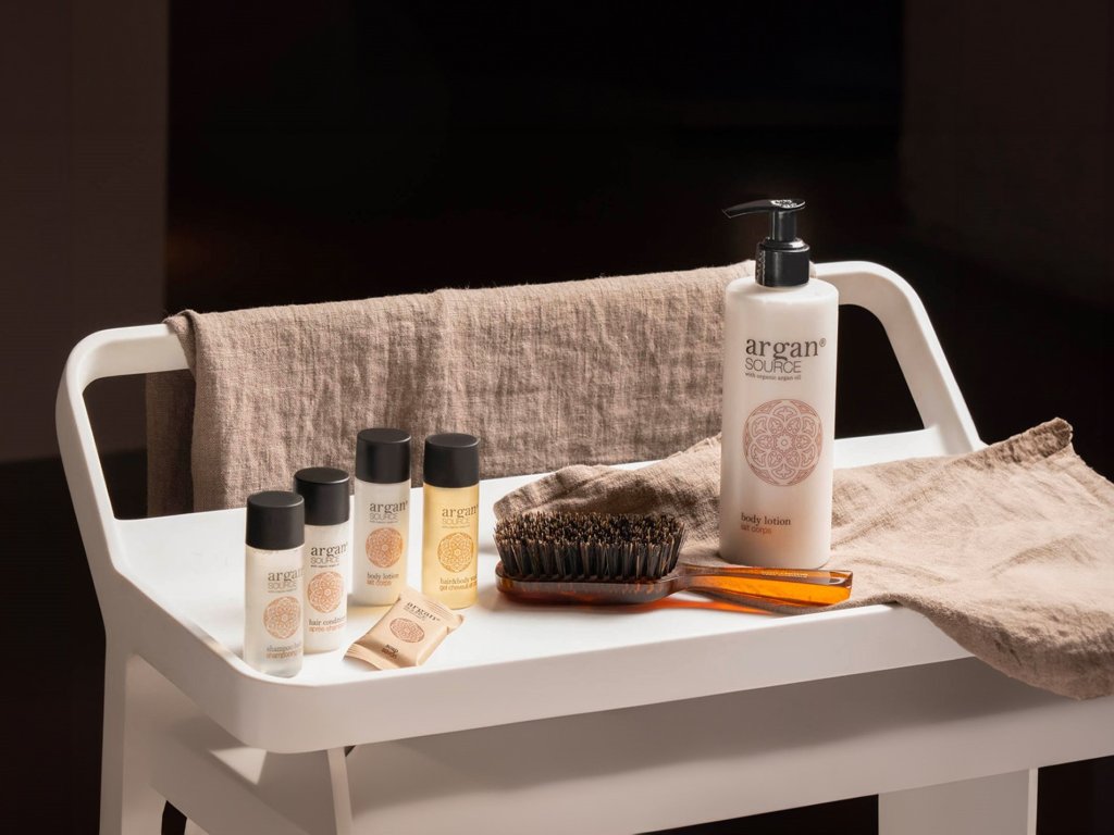 Hotelkosmetik ARGAN SOURCE, die Bio-Arganöl enthält. Ein Schönheitselixier, das dank seiner Antioxidantien zu einer Notwendigkeit in der Kosmetik geworden ist. Es hat auch eine weichmachende und feuchtigkeitsspendende Wirkung. Der bezaubernde Duft und das elegante Satindesign bringen Ihre Gäste in die Atmosphäre Marokkos. Anspruchsvolle Qualität, inspiriert vom Gold der Wüste.