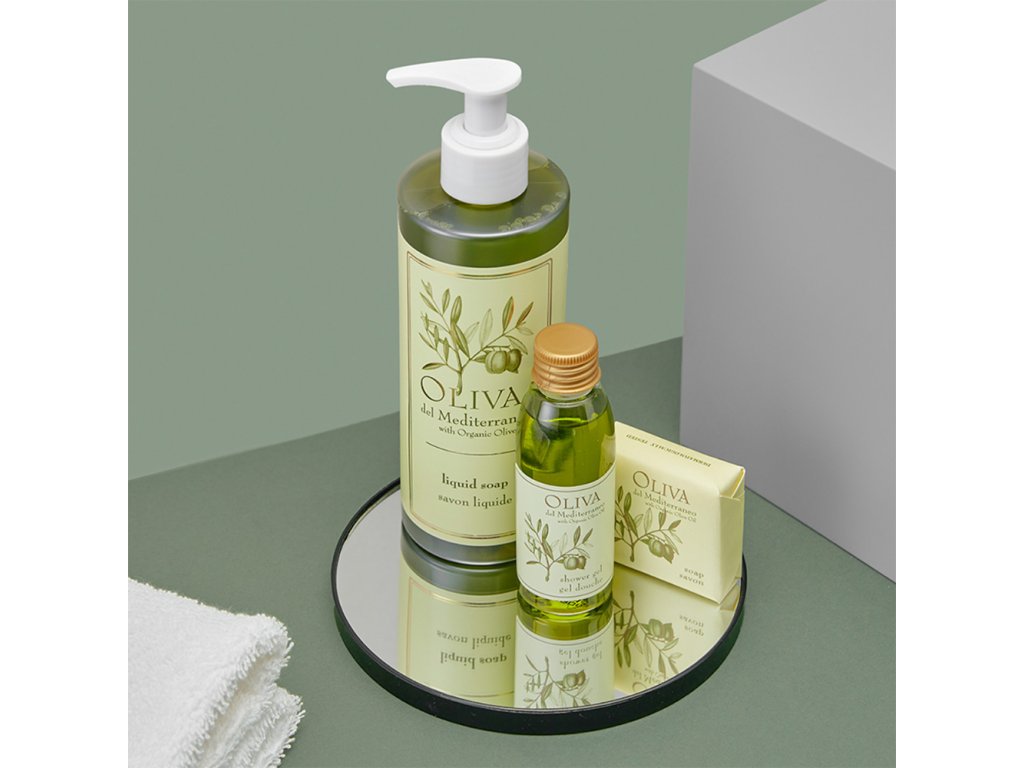 Hotelkosmetik OLIVA del Mediterraneo mit Bio-Olivenöl. Die Vitalität des Olivenöls liegt im Reichtum an Antioxidantien und wirkt gegen die freien Radikale, die für die Zellalterung verantwortlich sind. Vitamin E, Phytosterole, Tocopherol, Squalen erfüllen alle grundlegenden Funktionen, die die Haut benötigt, um langfristig jung und frisch zu bleiben. Diese Produkte reinigen sanft und hinterlassen eine straffe und geschmeidige Haut.