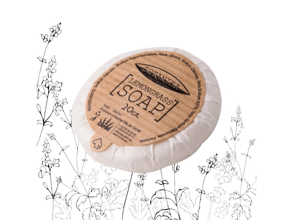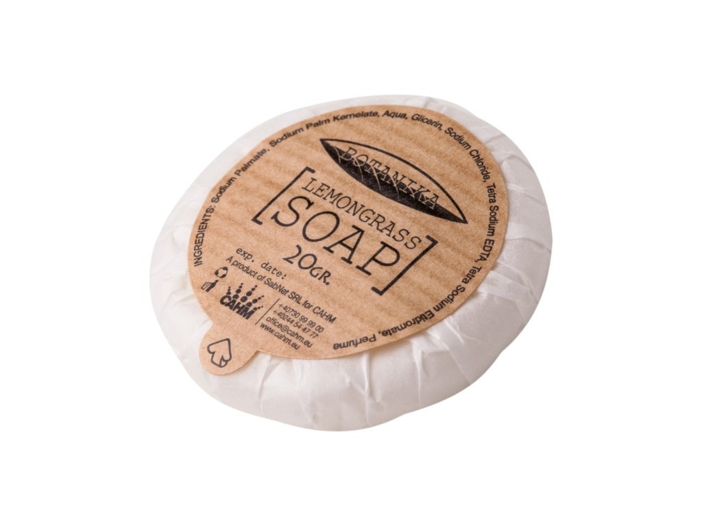 Die 20 g Botanika-Seife mit Zitronengrasduft ist in gefaltetem Plissépapier verpackt. Die Seife ist in einer 100 % biologisch abbaubaren Verpackung verpackt. Sie enthält keine Parabene, Silikone, Phenoxyethanol, GVO, Nanopartikel, Polyethylenglykol oder tierische Partikel.