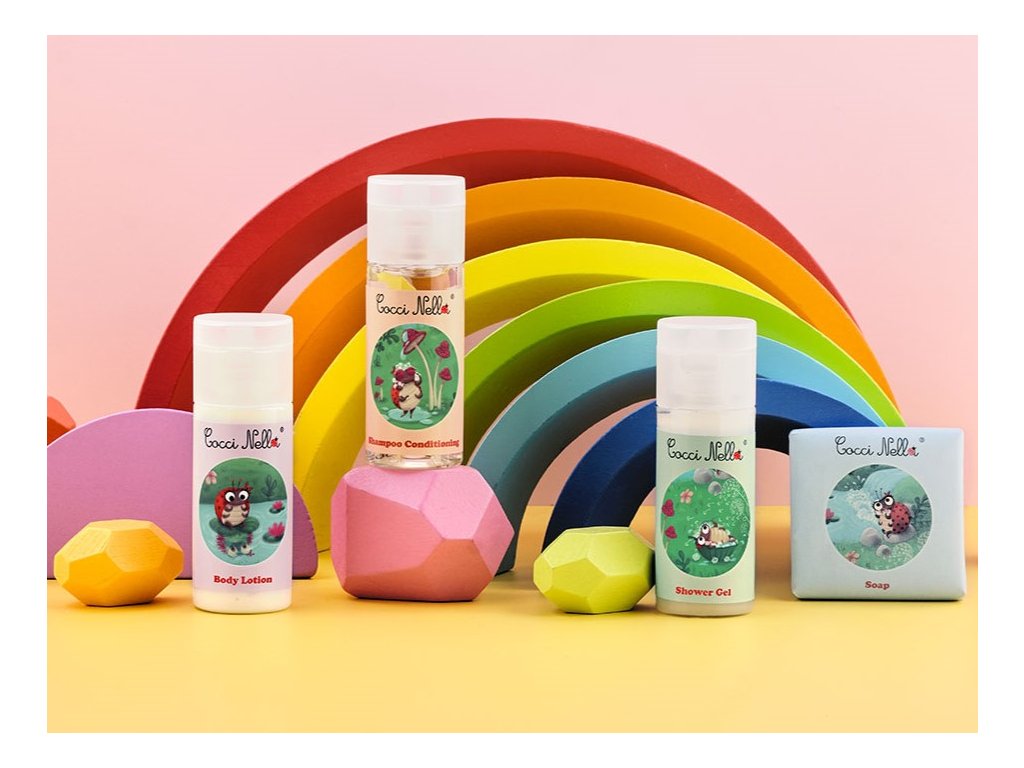 Ein feines Hotelset speziell für kleine Reisende. Die Seife und das Erfrischungstuch sind ideal zum Reinigen und Erfrischen von Kinderhänden. Der zarte Duft und die dicke, cremige Textur vermitteln den kleinen Gästen ein Gefühl natürlicher Frische.