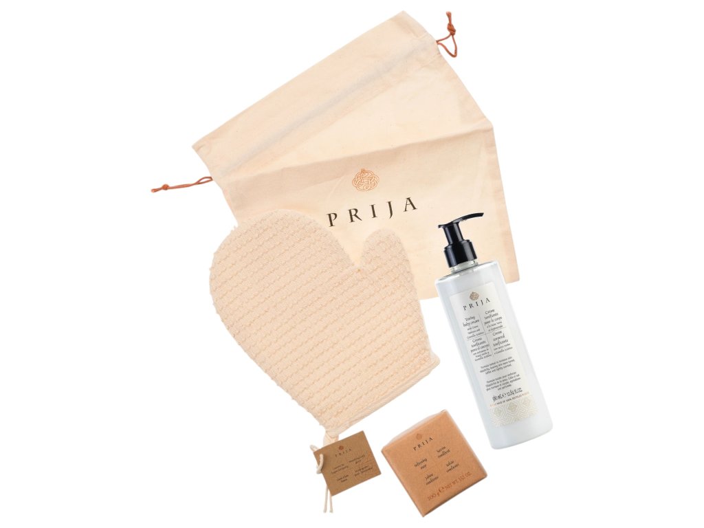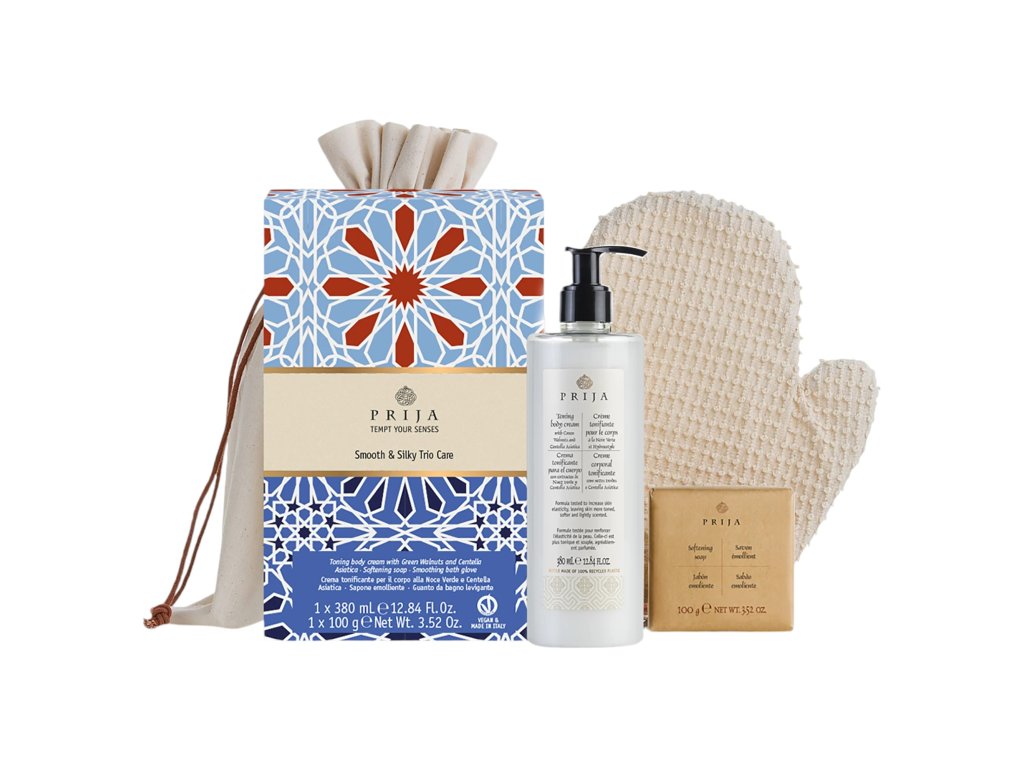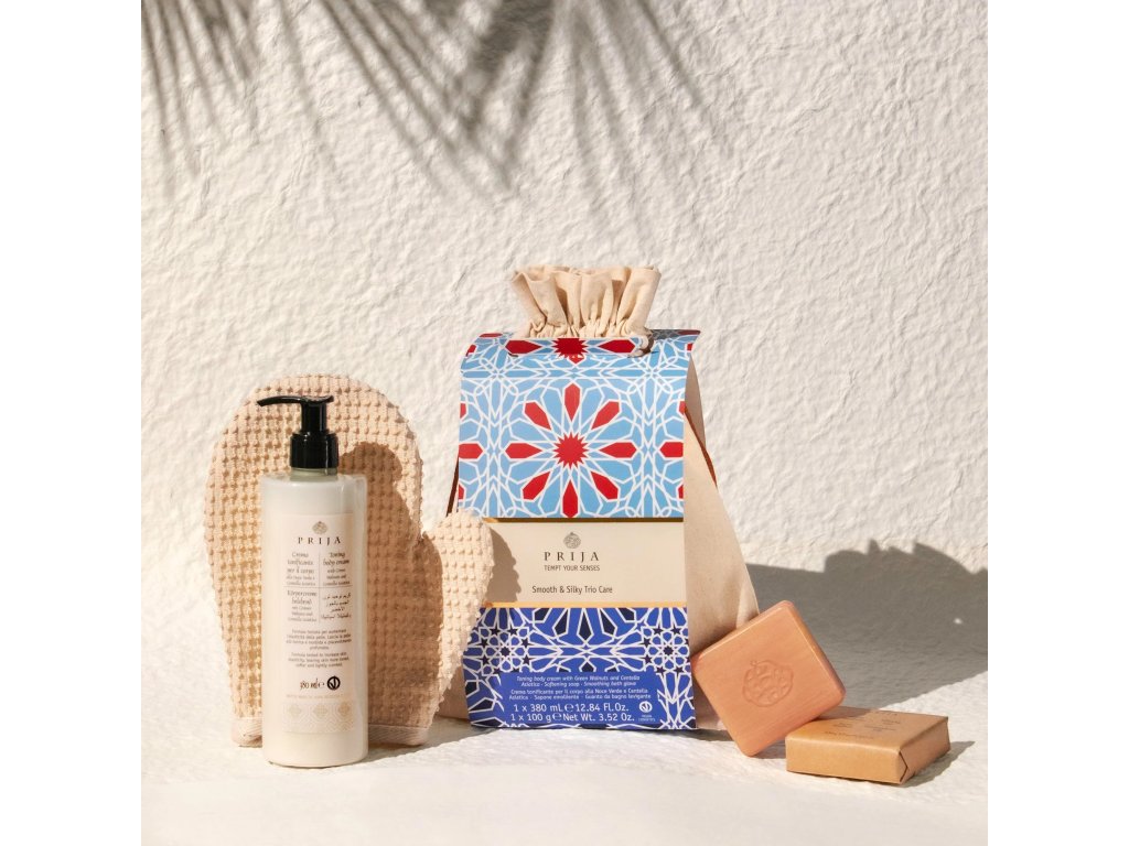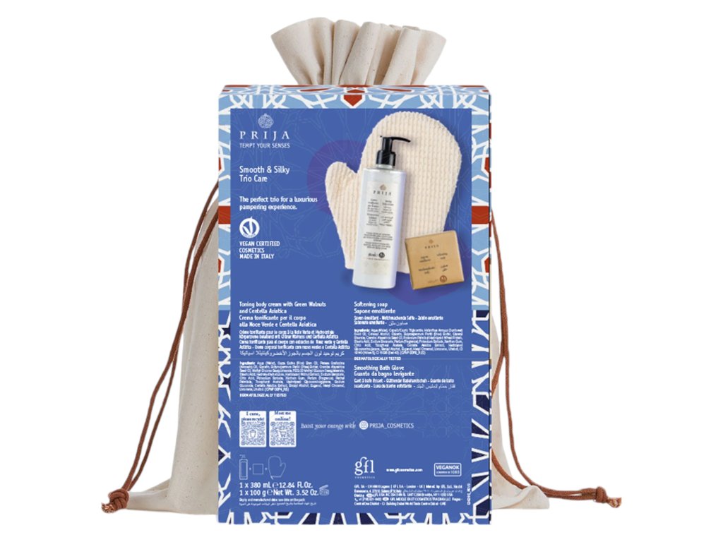 Lassen Sie Ihre Haut mit dem PRIJA Smooth & Silky Pflege-Trio-Set verwöhnen, danach wird Ihre Haut himmlisch glatt sein. Der Glättungshandschuh garantiert eine maximale Durchblutung der Haut und befreit sie gleichzeitig von abgestorbenen Zellen. Die erweichende Seife von PRIJA mit einer hohen Konzentration an natürlichem Glycerin hat eine wunderbare perlmuttartige Textur und trägt zur Erhaltung und Wiederherstellung der Hautfeuchtigkeit bei. Sein warmer und entspannender Duft wird Sie verzaubern und zu einem Teil Ihrer täglichen Hygiene werden.Die tonisierende Körpercreme mit grünen Walnüssen und Centella Asiatica erhöht die Elastizität der Haut, die Haut ist nach der Anwendung straffer und weicher. Der warme und entspannende Duft wird Sie verzaubern und Ihre Sinne streicheln.