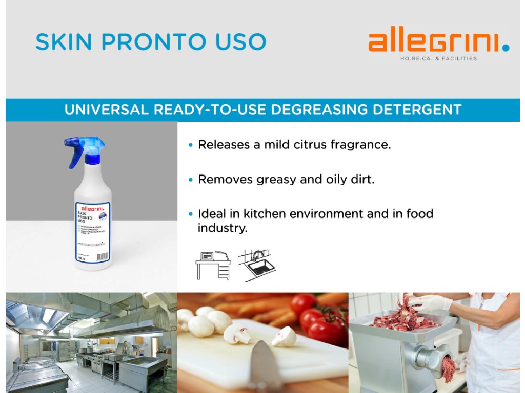 SKIN PRONTO USO ist ein hochwirksamer, schaumarmer Flüssigreiniger, der selbst hartnäckigste Flecken von Stahl-, Teflon- und Kunststoffoberflächen mühelos beseitigt. Dank seiner einzigartigen Universaleigenschaften eignet er sich ideal zur Entfernung von alltäglichem Schmutz von allen Oberflächen, wie z. B. Kunststoffen, Gummi, Kunstleder, harten und lackierten Oberflächen, und ist in allen Industriezweigen einsetzbar. Er verströmt einen dezenten Zitrusduft.