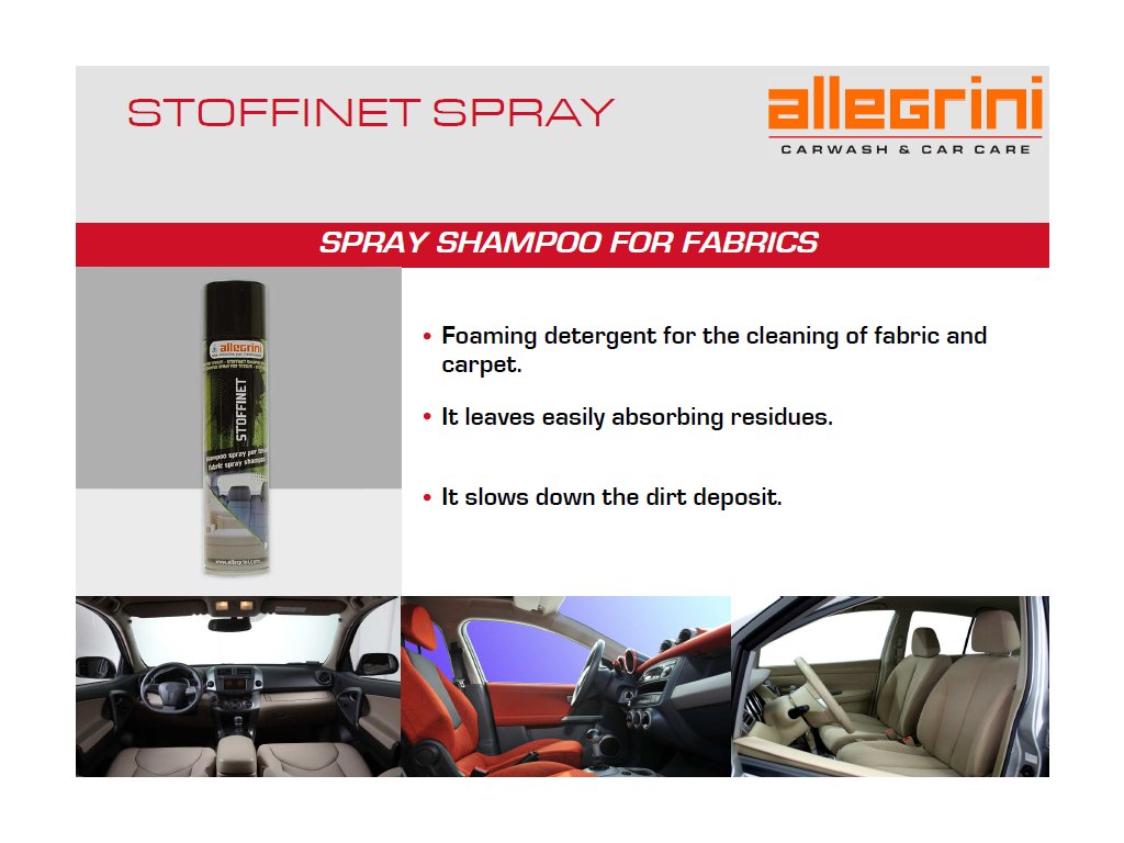 VERWENDUNG: Die Reinigung des Innenraums eines Autos erfordert normalerweise einen komplizierten Prozess und die erforderlichen Maschinen. STOFFINET SPRAY ist ein Schaumprodukt zur Reinigung von Stoffen und Teppichen. Es reinigt vorbildlich und hinterlässt trockene und nicht hygroskopische Rückstände, die leicht zu entfernen sind. Es hinterlässt eine schützende Patina, die die Ablagerung von Schmutz verlangsamt. STOFFINET SPRAY ist ideal für alle Arten von Polstern, Sitzen, Stoffen, Teppichen, Schuhen ... Um die besten Textilreinigungsergebnisse zu erzielen, empfehlen wir, mit einem kräftigen Schläger mit M15 LAVAMOQUETTE oder SKIN UNIVERSAL zu klopfen