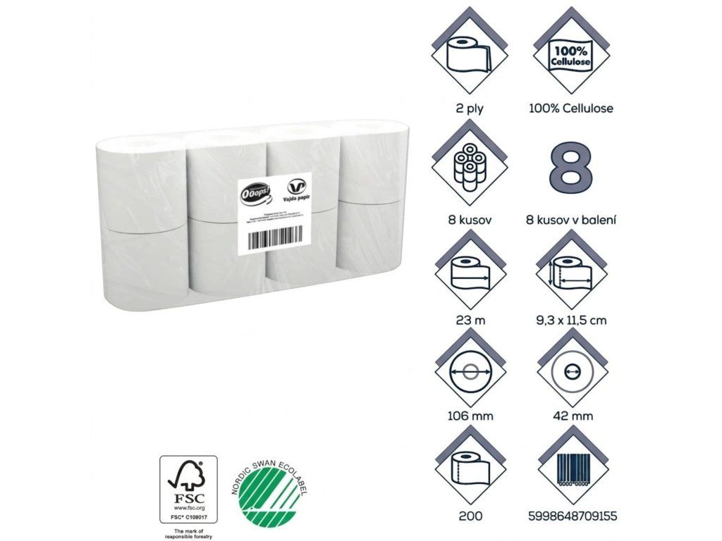 Sorgen Sie für Hygiene und sparen Sie mit Ooops! Toilettenpapier Diese Packung mit 200 Blatt auf 8 Rollen ist ideal für den täglichen Gebrauch zu Hause oder im Hotelzimmer. Dank seiner festen, aber dennoch weichen Struktur ist das Toilettenpapier sanft zur Haut.